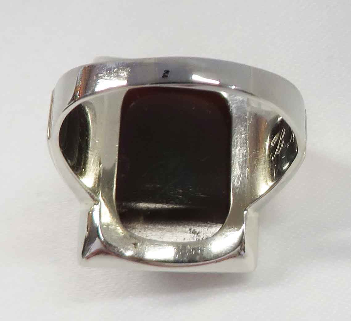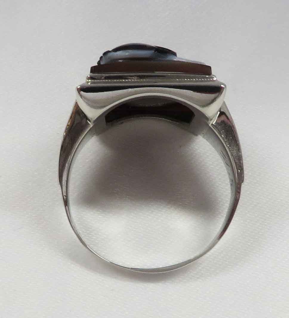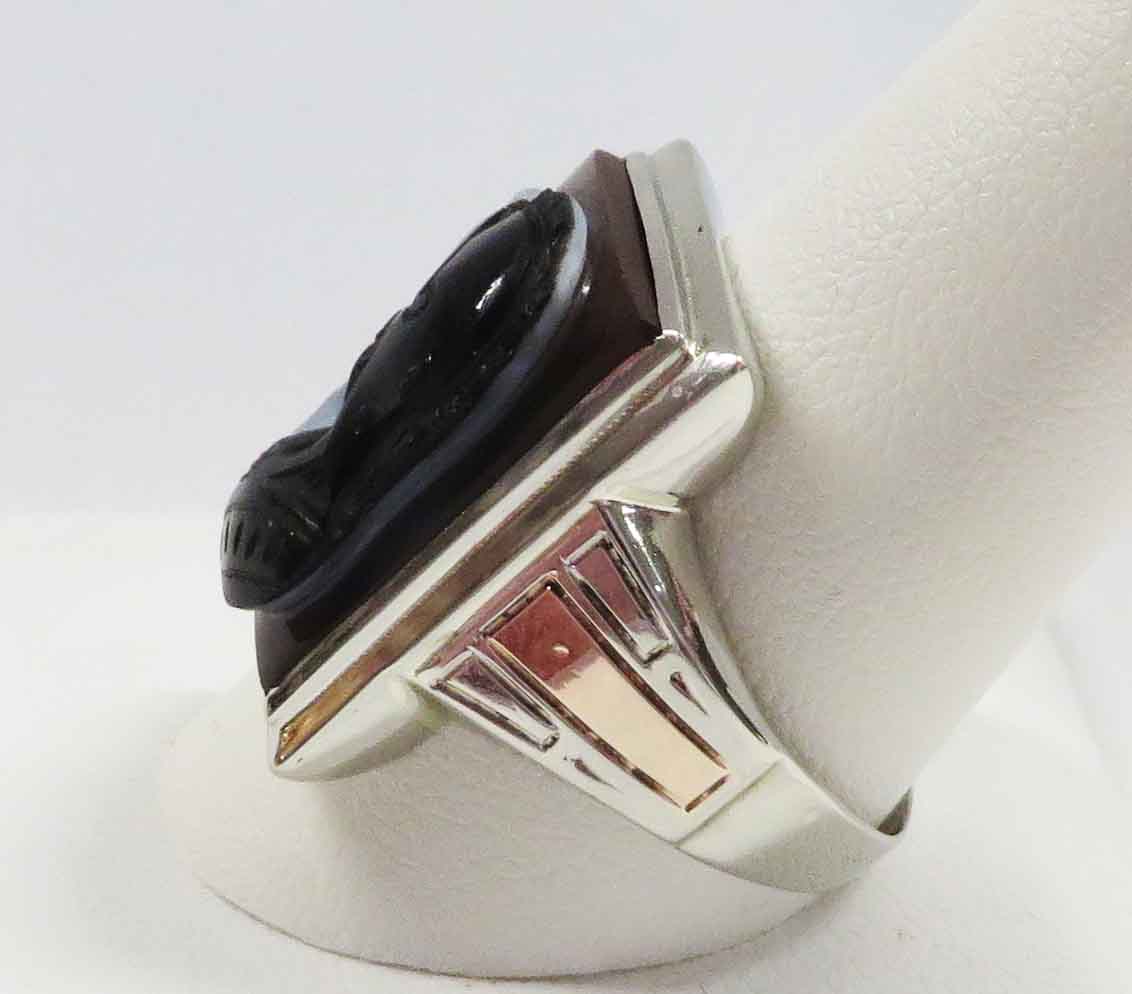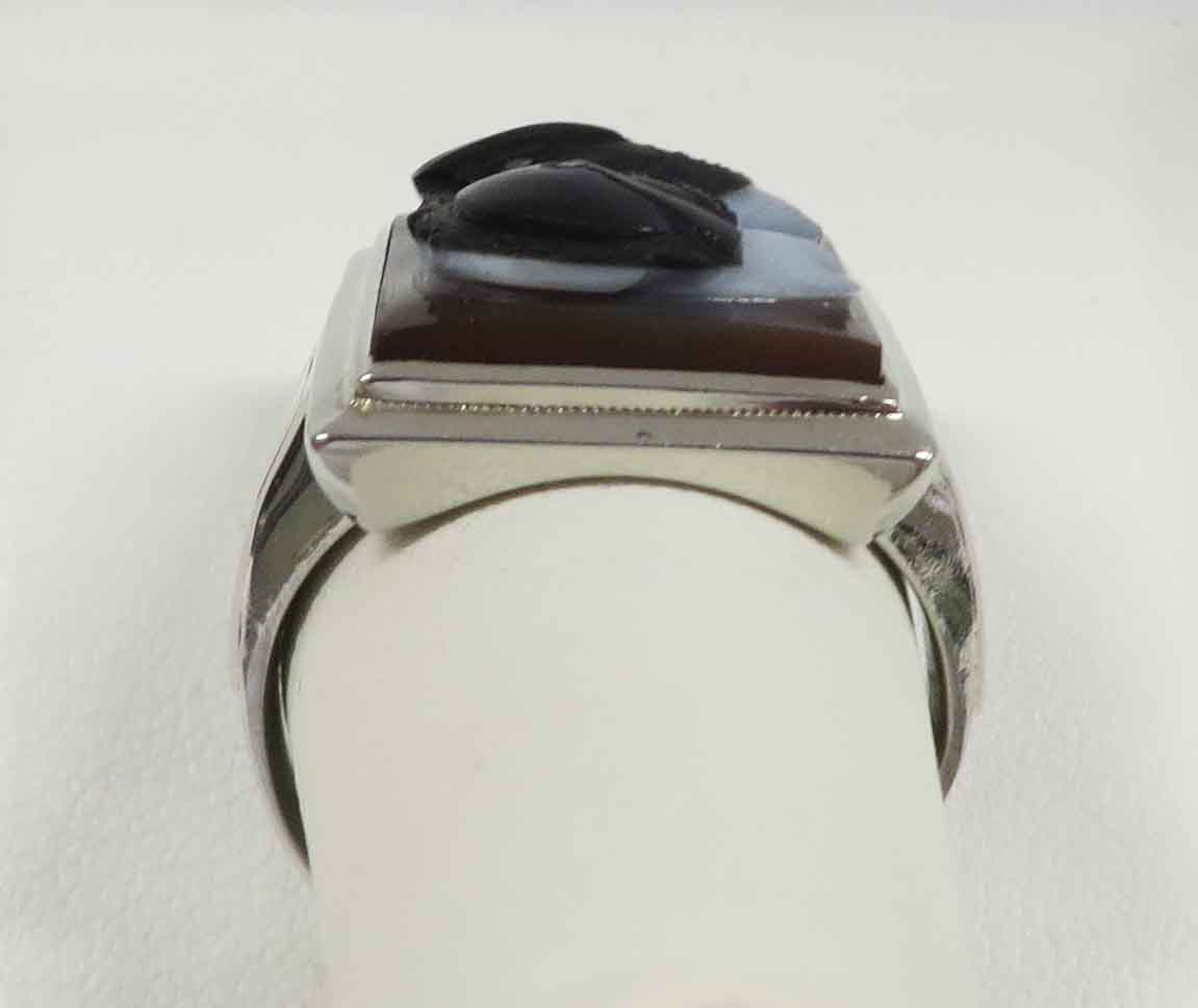 Two Faced Deco is a Two Faced is a 10 karat White Gold Man’s Hardstone Art Deco Cameo Warrior Ring.  This interesting Ring features a two faced, one white (quite small) and the other brown carved hardstone Cameo Warrior Face.  This hardstone Cameo Ring is bezel set atop a fancy embossed White Gold leaf and shield etching along with other angled lines mounting.  The hardstone Warrior Cameo measures 3/4″ x 1/2″.   Hallmarked “10K”.   Size 7 1/4″.  Circa 1930’s. This interesting Ring features a two faced, one white (quite small) and the other a black carved Hardstone Cameo Warrior Face.  This brown background Hardstone Cameo is bezel set in a 10 karat White Gold mounting with a wide shank and a Rose Gold bar in the center of the shank.  The Hardstone Warrior Cameo measures 3/4″ x 1/2″.  Size 11″.  Circa 1930’s.
