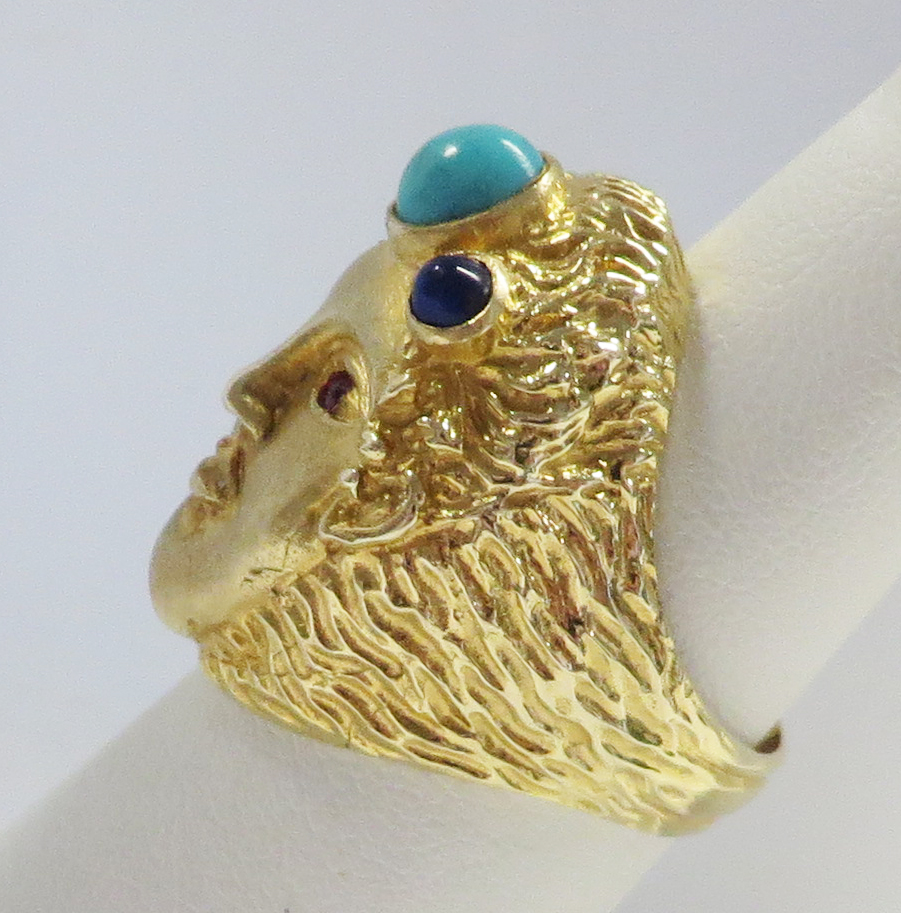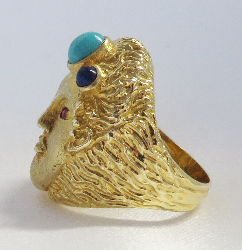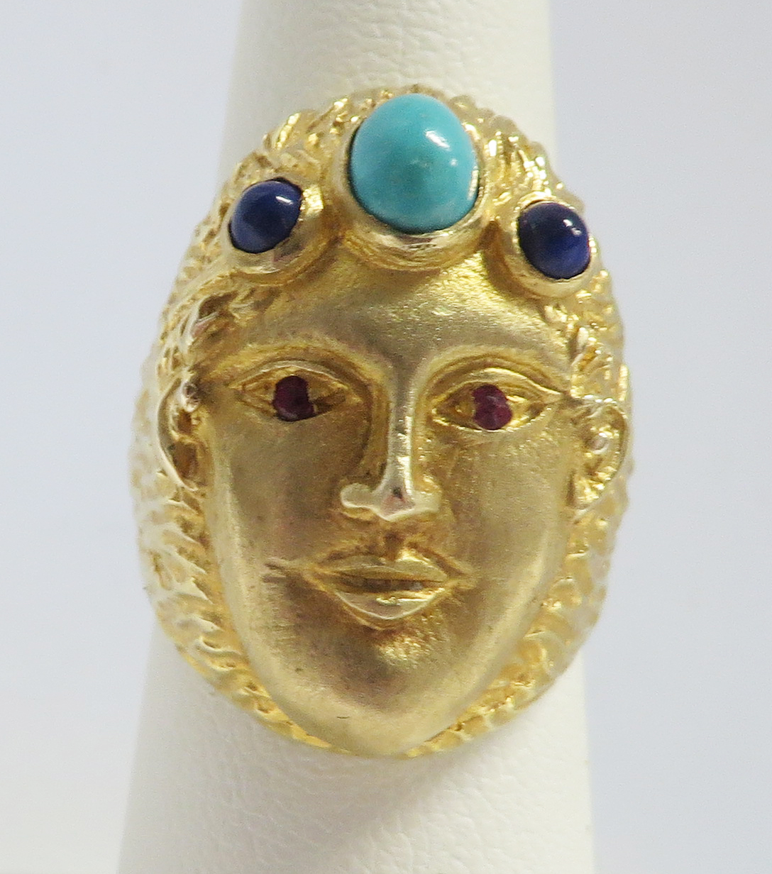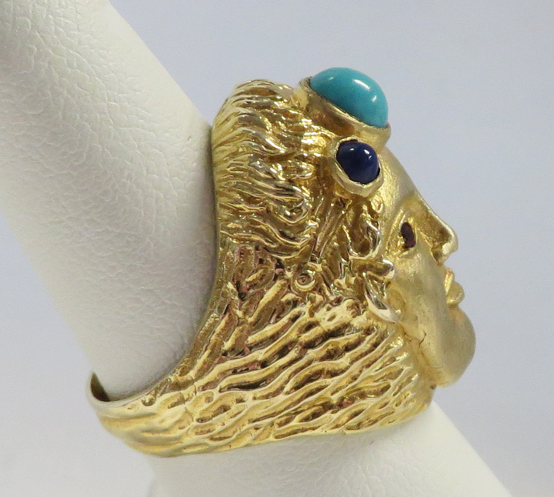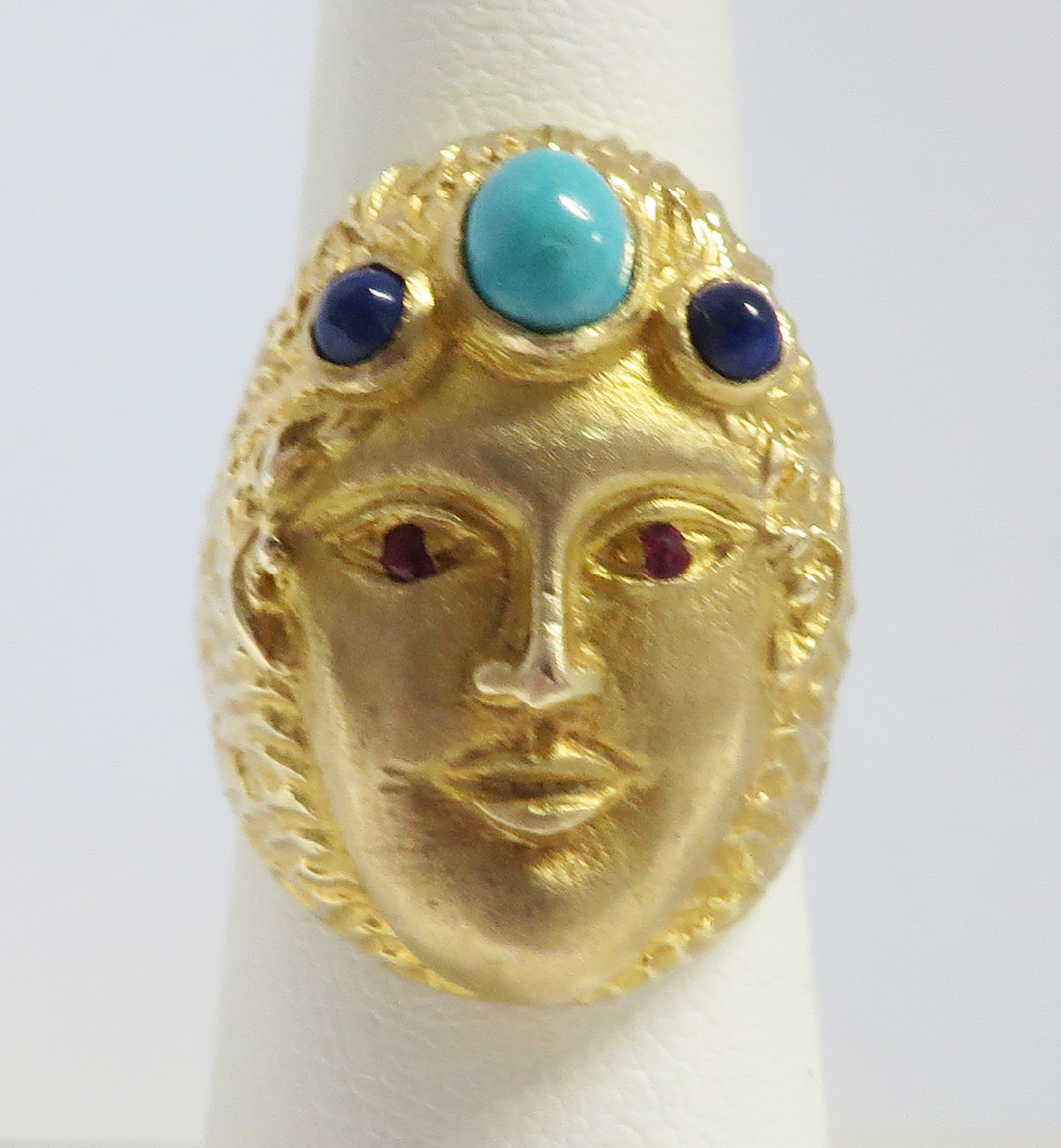 Who Am I is a 14 karat Yellow Gold Gemstone Face Ring.  This neat looking Face Ring features a headband of a bezel set oval Turquoise stone surrounded by a small round bezel set cabochon Lapis stone.  The Eyes are small round prong and bezel set Rubies.  The framing headband around the face and the flowing hair is highly embossed to offset the smooth face.  The flowing embossed hair forms the side shanks of the Band of this Ring.  Hallmarked “14K”.  Size 6 1/4″.