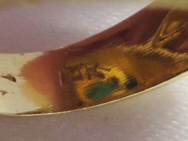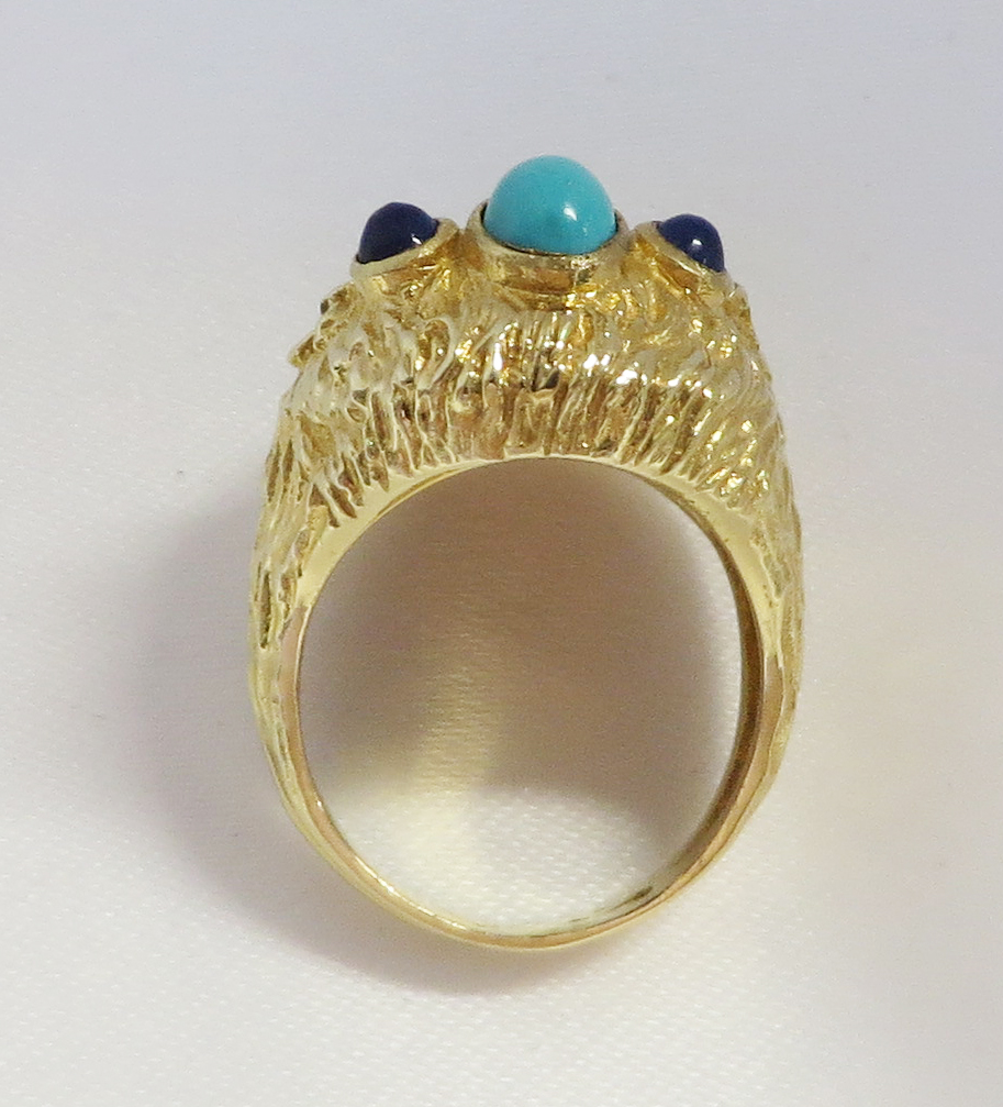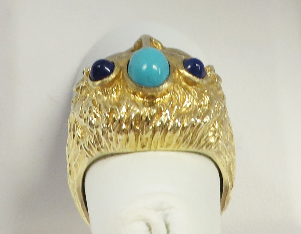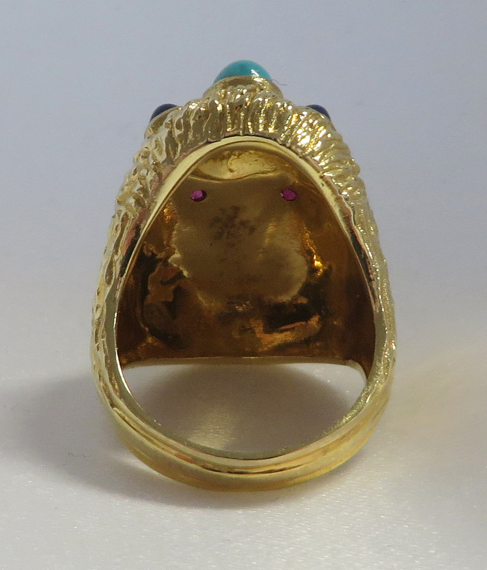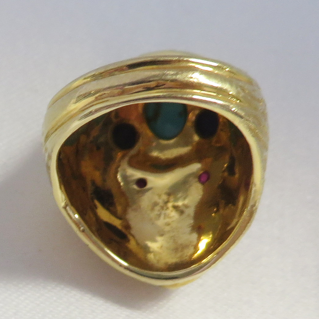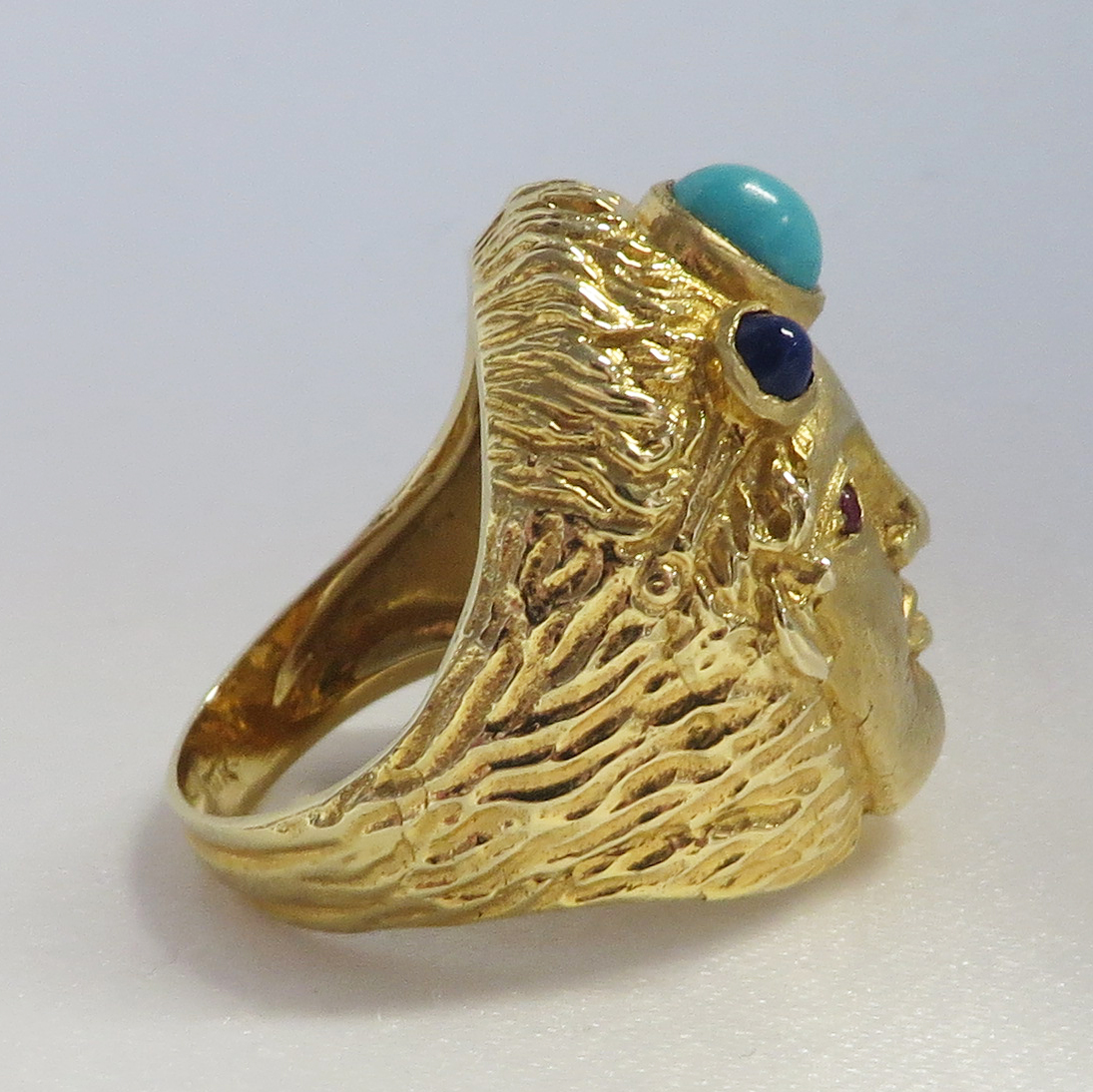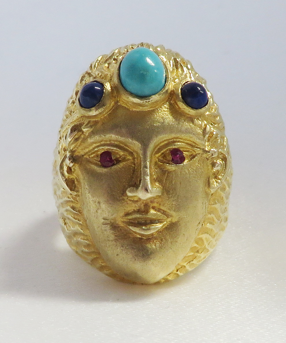 Who Am I is a 14 karat Yellow Gold Gemstone Face Ring.  This neat looking Face Ring features a headband of a bezel set oval Turquoise stone surrounded by a small round bezel set cabochon Lapis stone.  The Eyes are small round prong and bezel set Rubies.  The framing headband around the face and the flowing hair is highly embossed to offset the smooth face.  The flowing embossed hair forms the side shanks of the Band of this Ring.  Hallmarked “14K”.  Size 6 1/4″.