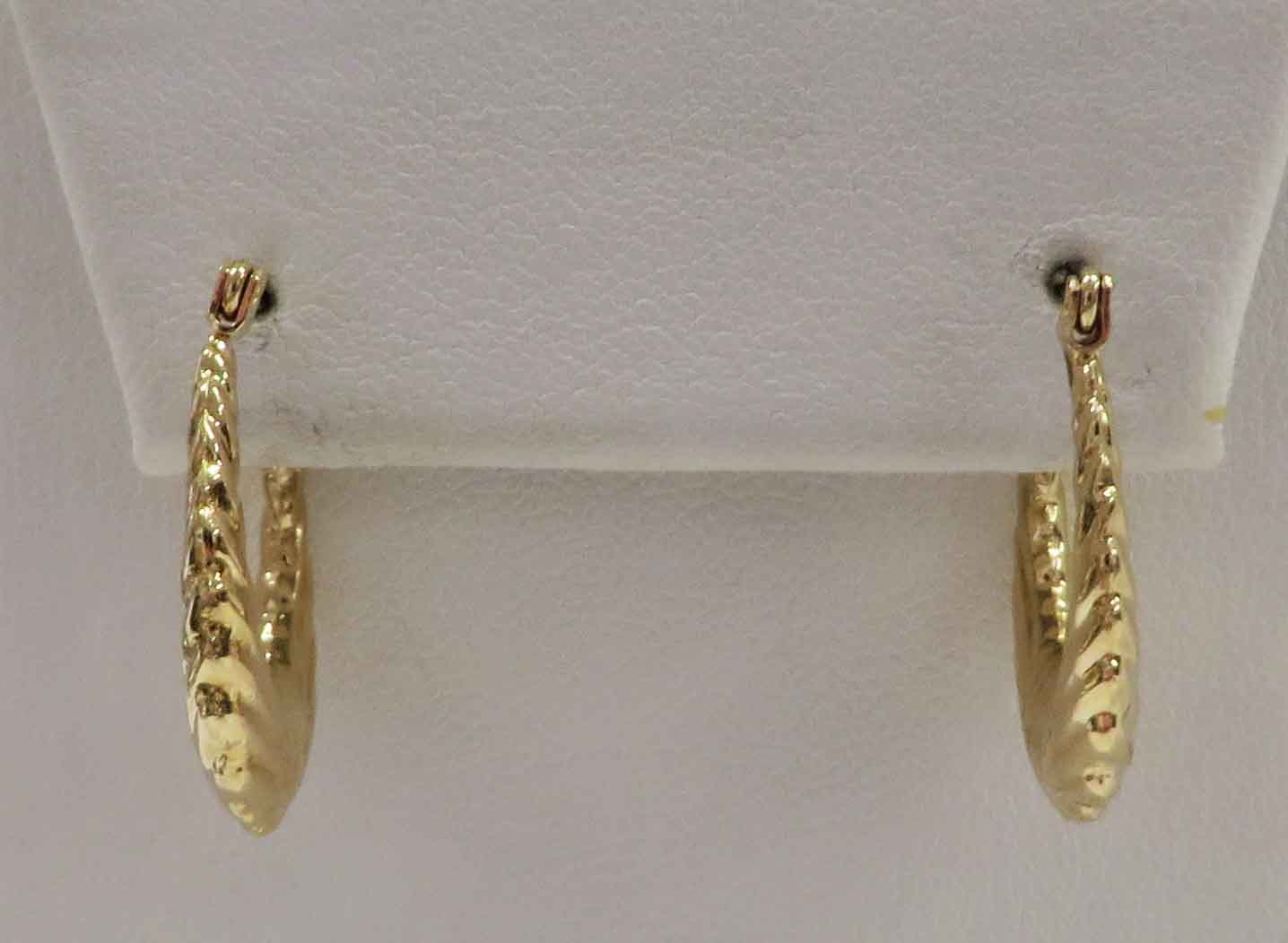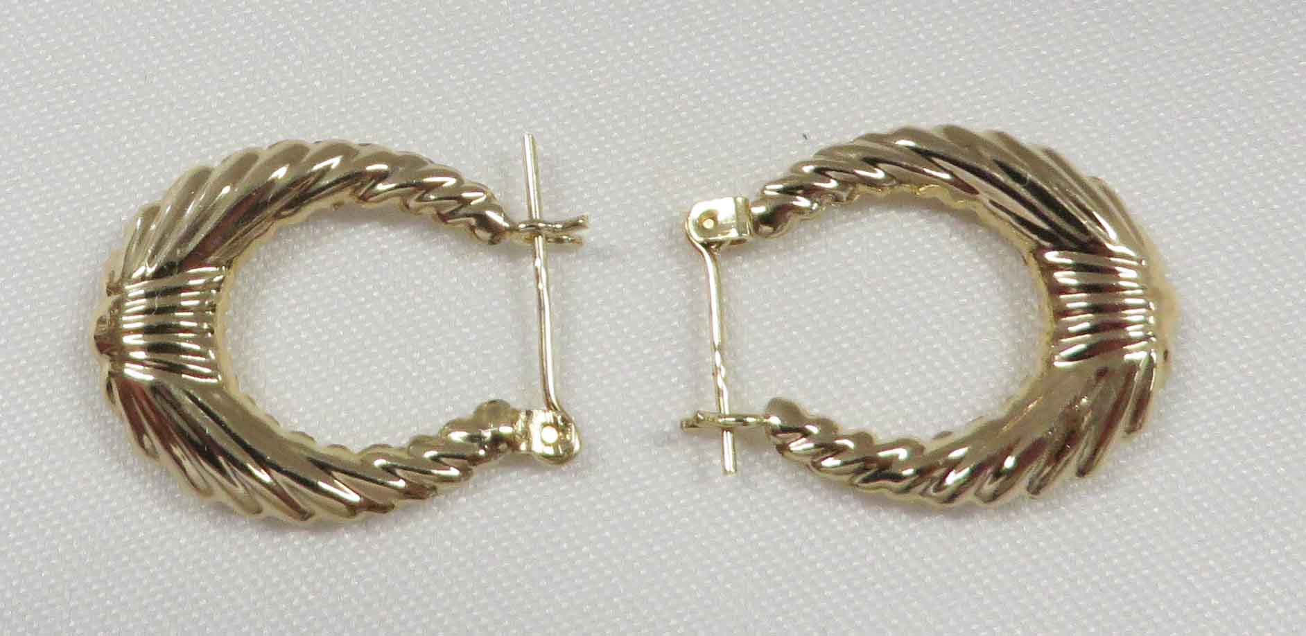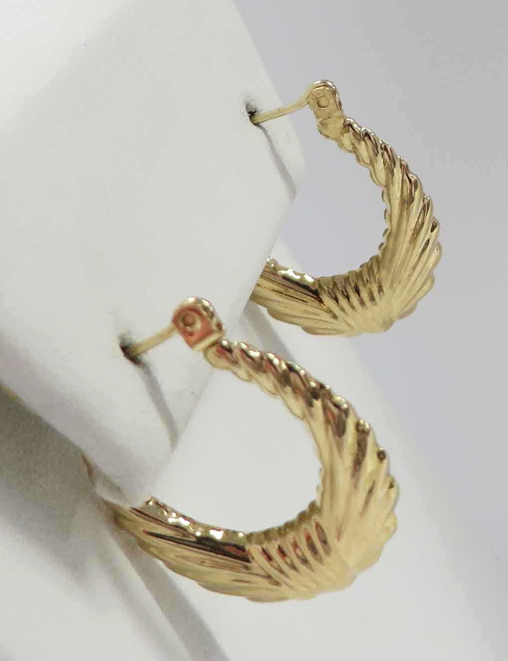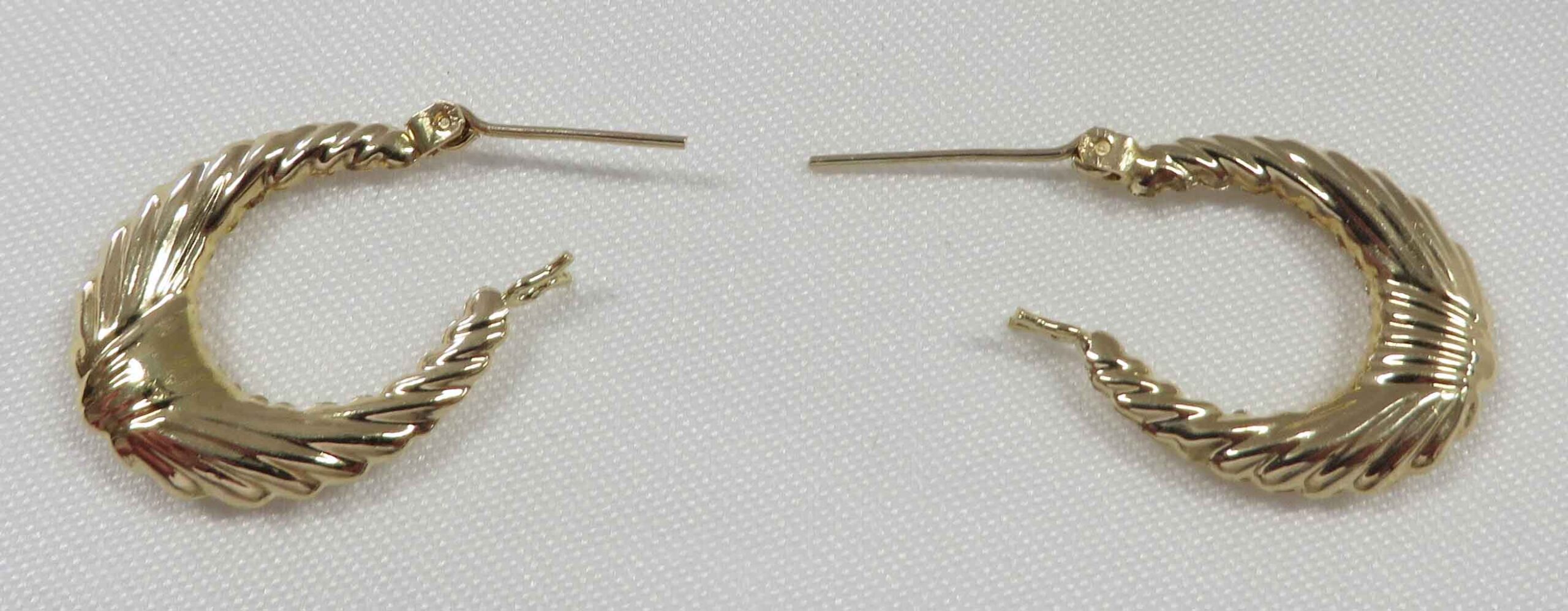 Wreath Hoops are 14 karat Yellow Gold Hoop Earrings. These pretty Hoops have a wreath (fern like) like design going up both ends with a tie wrap in the middle. They measure 7/8″ x 3/4″ .