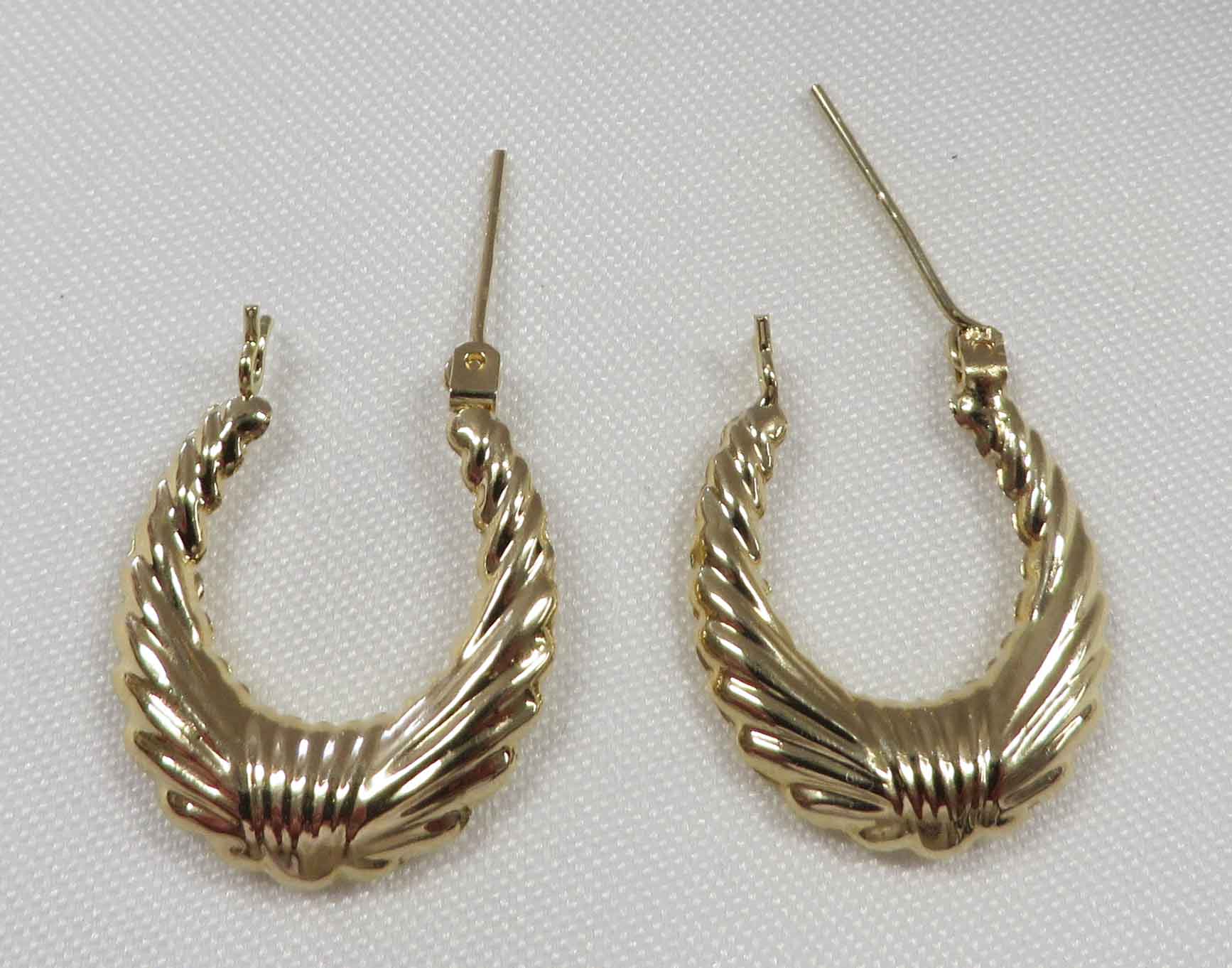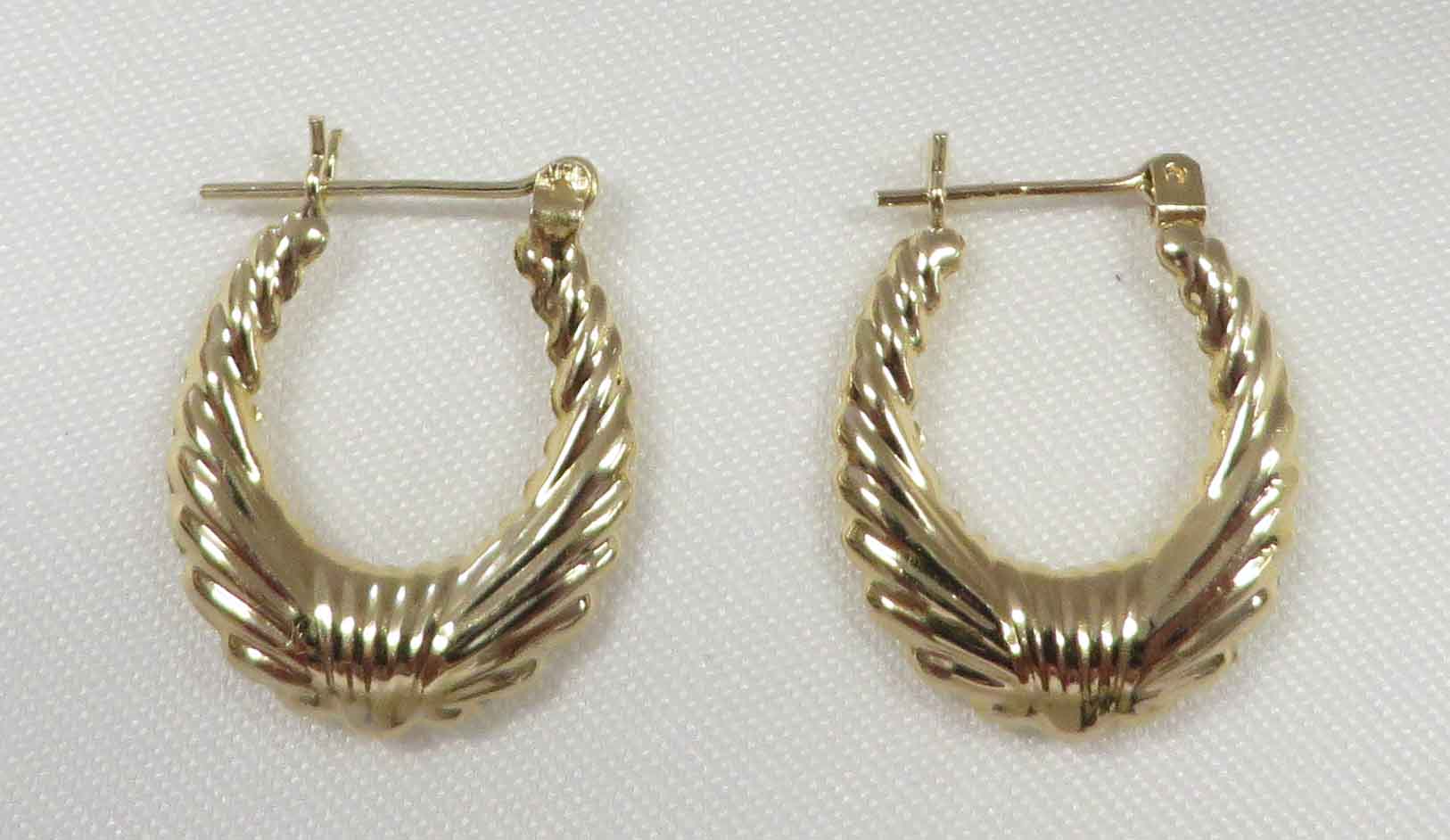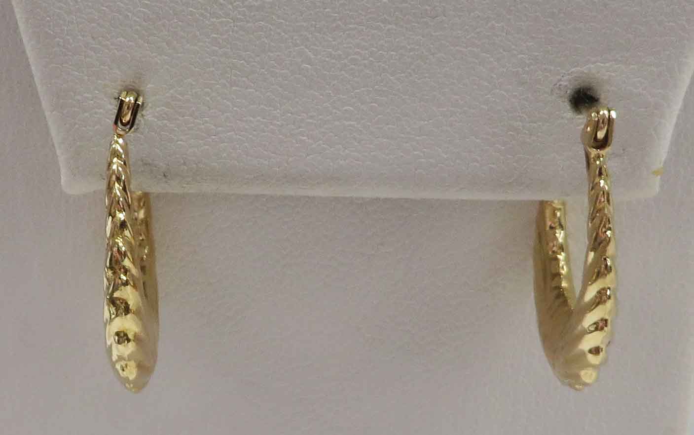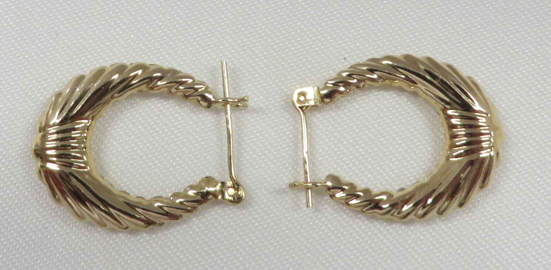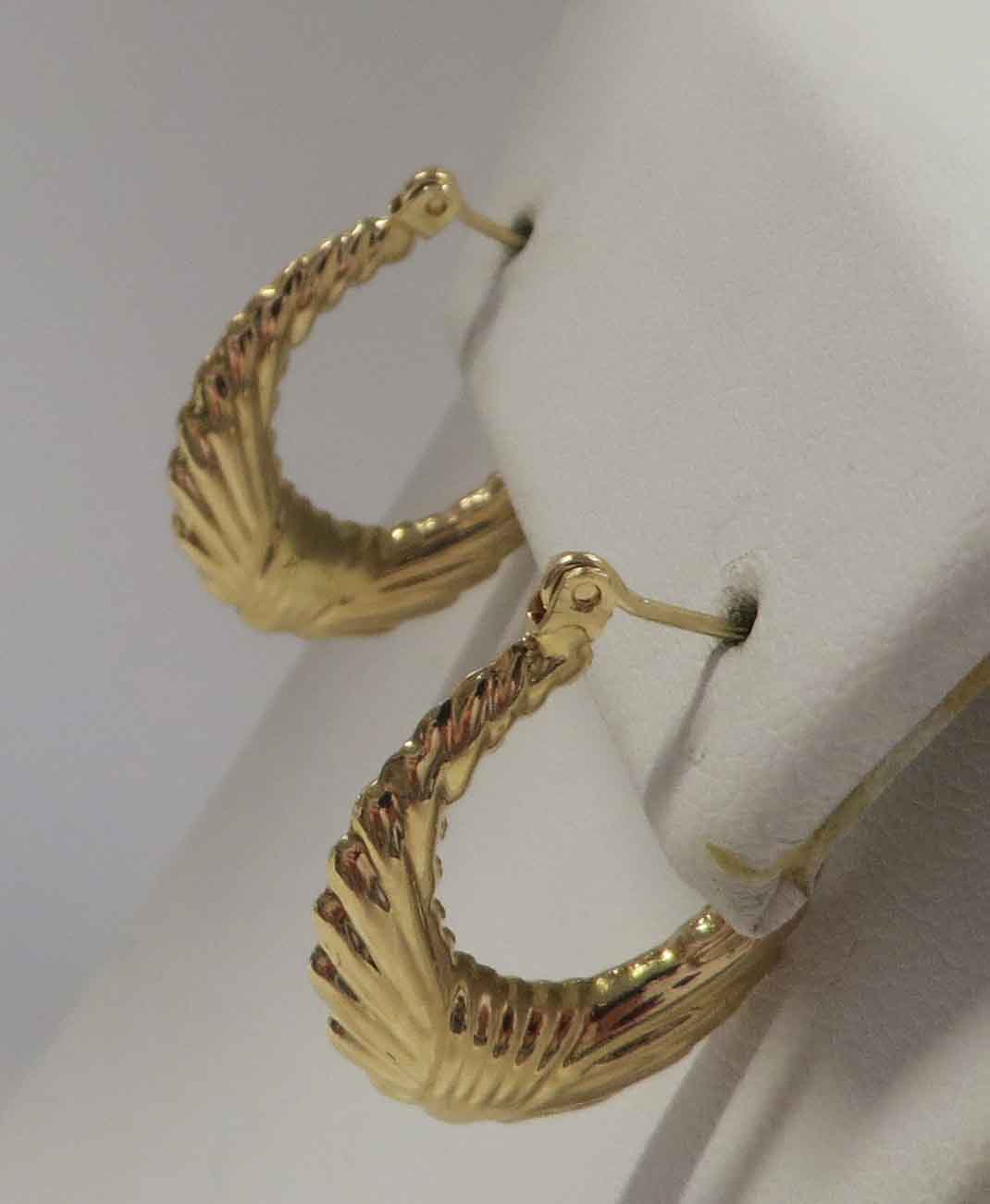 Wreath Hoops are 14 karat Yellow Gold Hoop Earrings. These pretty Hoops have a wreath (fern like) like design going up both ends with a tie wrap in the middle. They measure 7/8″ x 3/4″ .